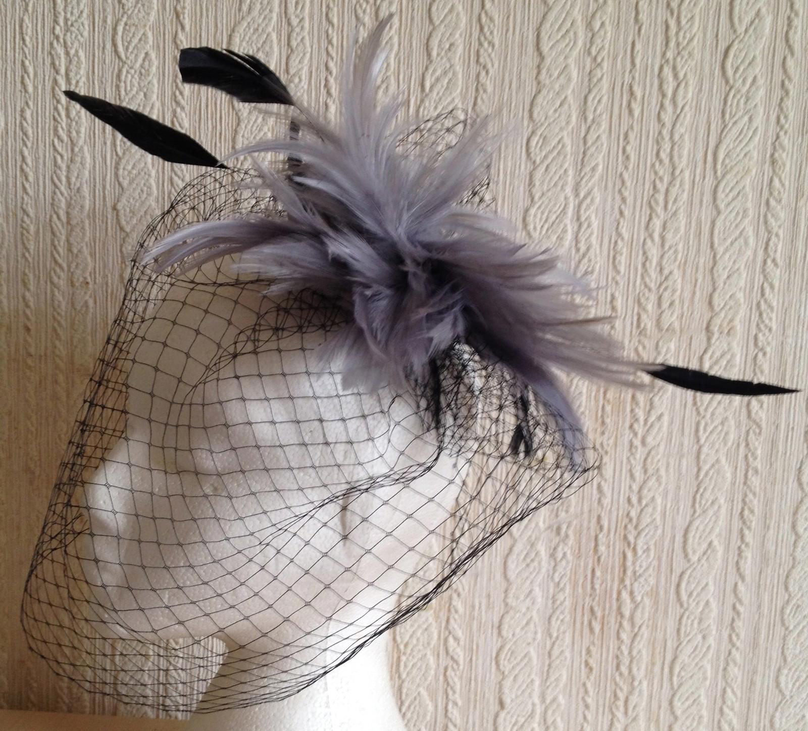 grey feather black veiling fascinator millinery brooch clip ascot wedding bridal