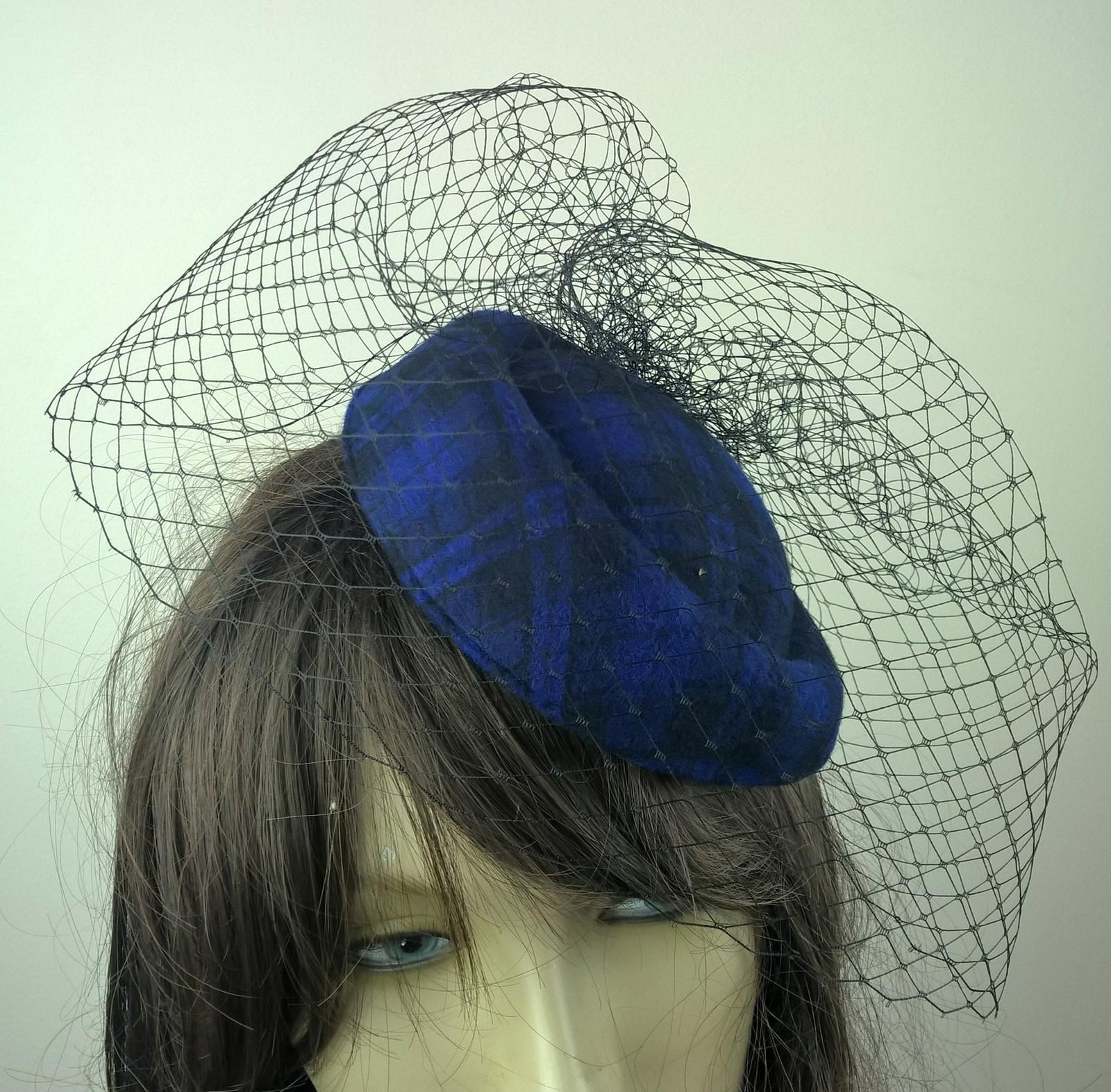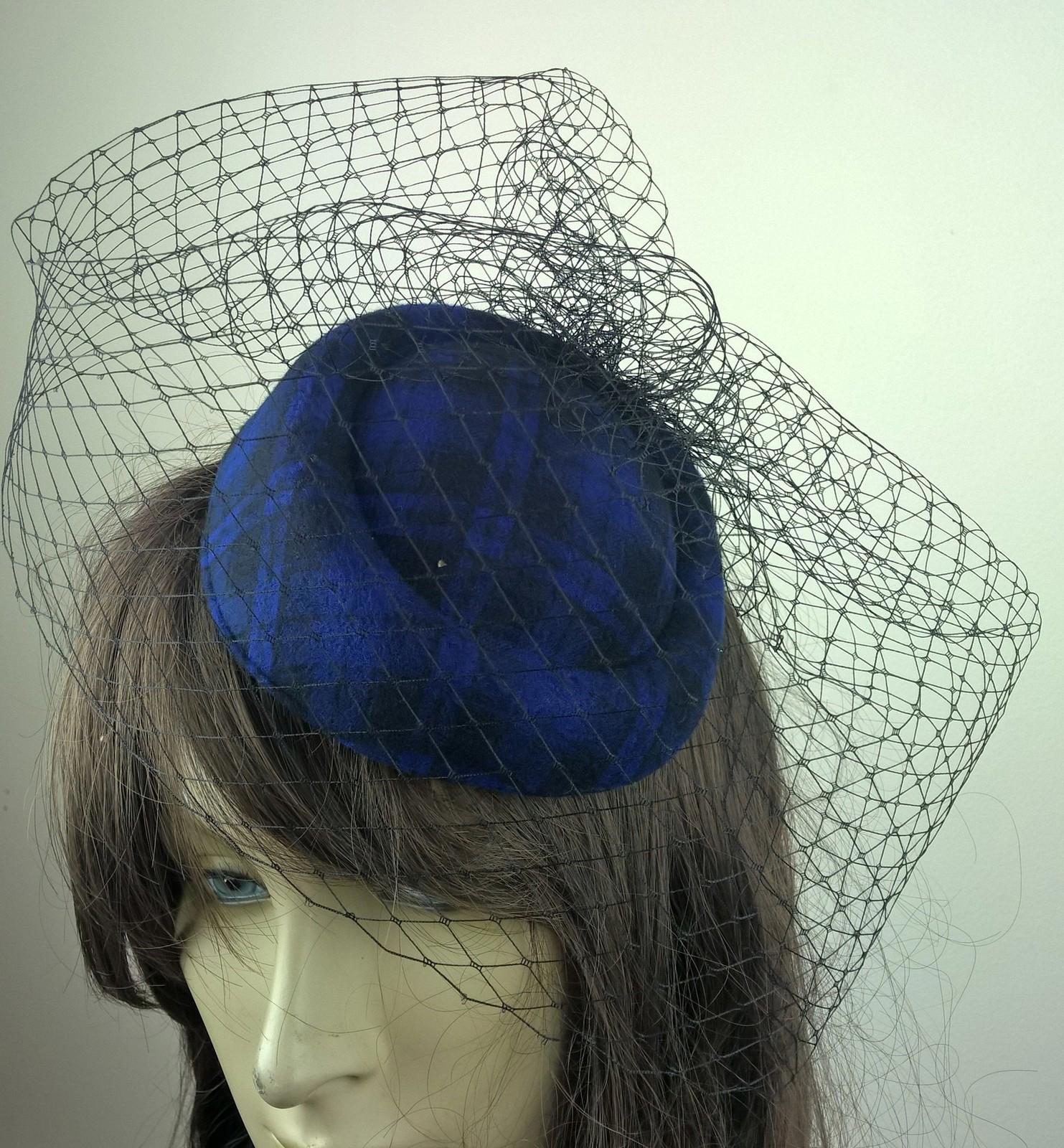 royal blue felt mini pill box hat black veiling french veil fascinator wedding