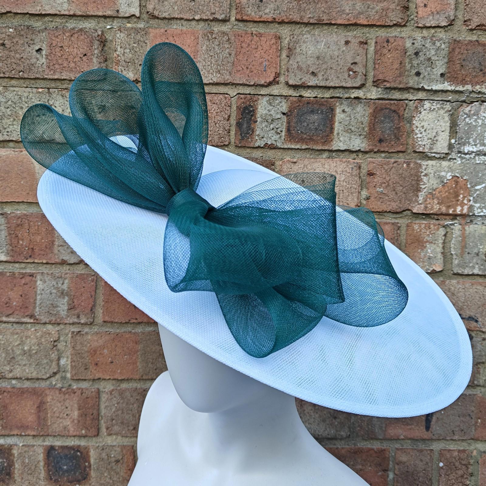 white dark green large fascinator wedding hat handmade hatinator Ascot bow